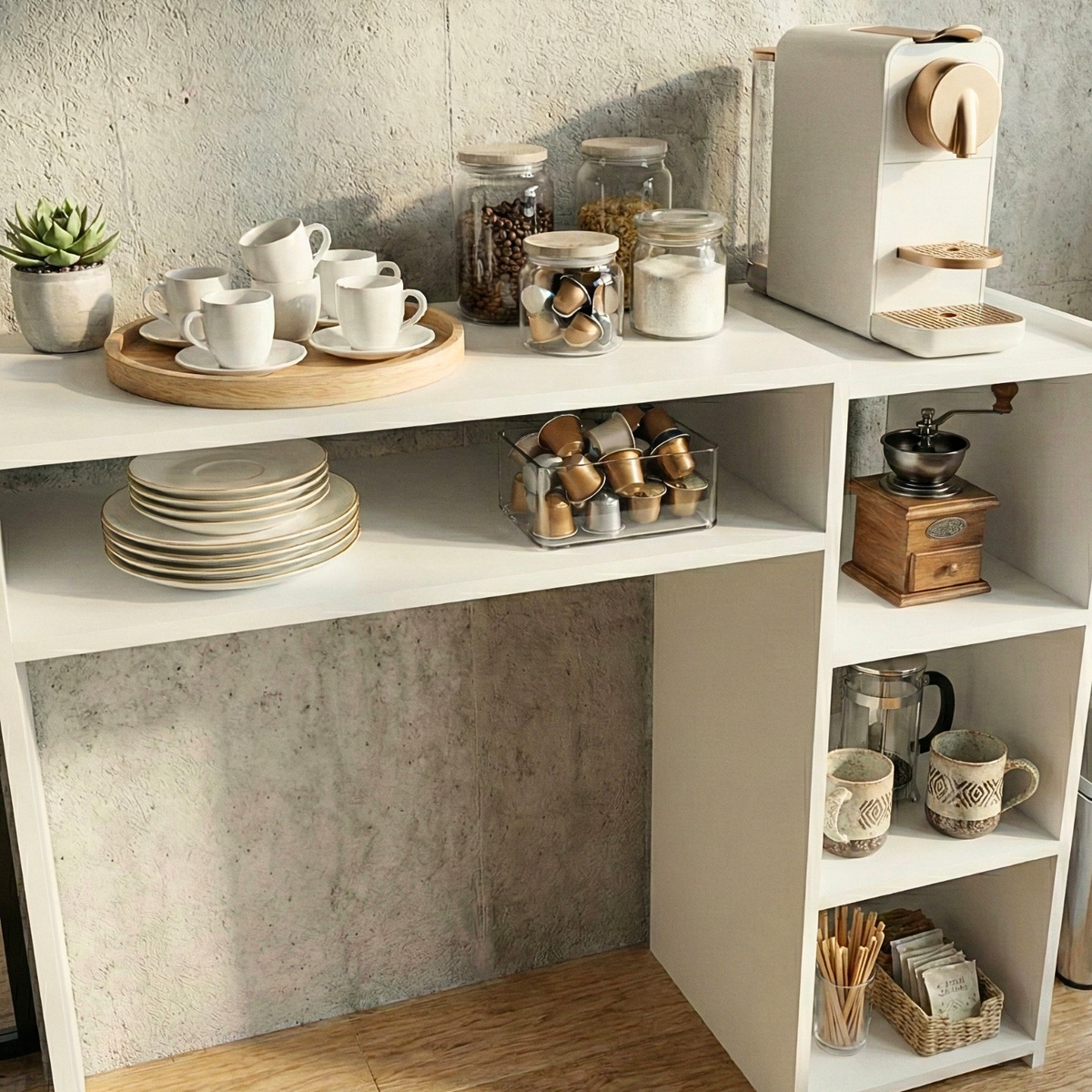 Aparador de design moderno e acabamento de MDF Branco. Modelo versátil e compacto, indicado para uso como estação de café, aparador de hall, mesa lateral ou mesa auxiliar de escritório. O tampo é resistente e de fácil higienização.