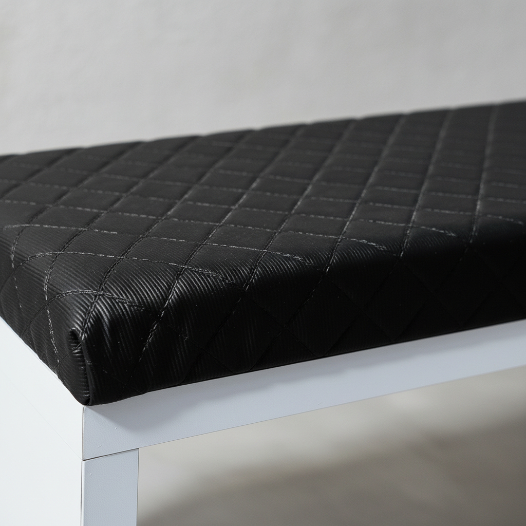 • Conforto e praticidade: Feito em MDF branco, com almofadado revestido em corino, que facilita a limpeza e não absorve sujeiras.